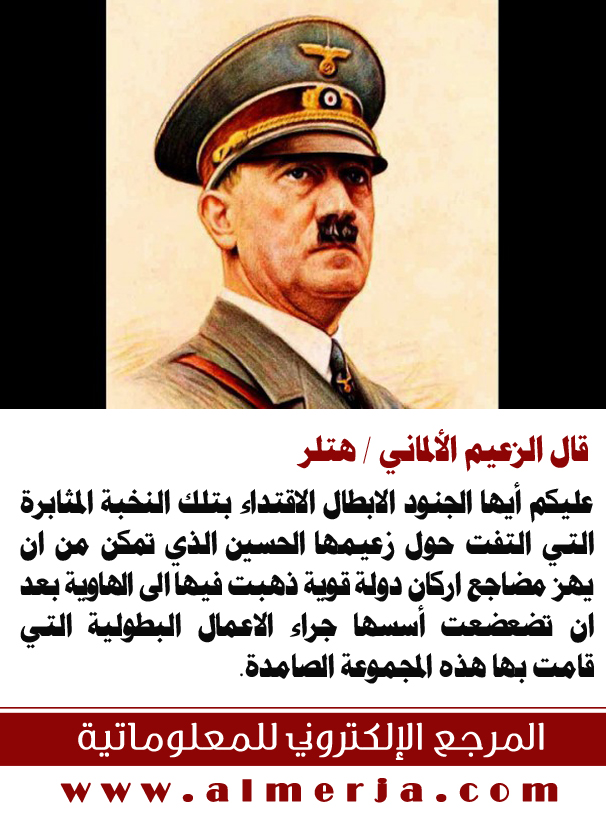 أدولف هتلر ولد في تاريخ 20 نيسان 1889م في النمسا حكم ألمانيا من خلال منصب مستشار الدولة (رئيس الوزراء) ما بين عامي 1933 إلى 1945 بدكتاتورية، وانتهاجه لسياسات ساهمت في إشعال الحرب العالمية الثانية ووقوع مجزرة جماعية راح ضحيتها 6 ملايين يهودي عرفت بالهولوكوست، إضافةً لخمسة ملايين مدني آخرين أقدم هتلر على الانتحار هو وزوجته إيفا براون في مخبئه ببرلين في الثلاثين من نيسان/ أبريل عام 1945 .