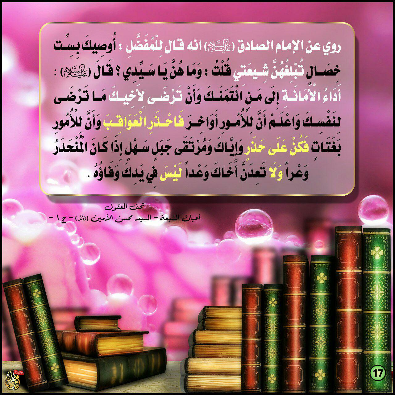 روي عن الامام الصادق (عليه السلام) انه قال للمفضلِ : أوصيك بست خصال تبلغهن شيعتي قلتُ : وما هنَّ يا سيدي ؟ قال (عليه السلام) : أداء الأمانة الى من ائتمنك وأن ترضى لأخيك ما ترضى لنفسك واعلم ان للأمور أواخر فاحذر العواقب وأن للأمور بغتات فكن على حذر وإياك ومُرتقى جبل سهل اذا كان المنحدر وعراً ولا تعدنَّ أخاكَ وعداً ليس في يدك وفاؤهُ .