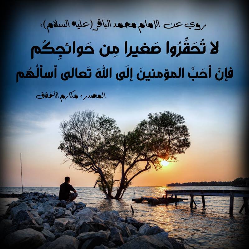رُوِيَ عن الإمام محمد بن علي الباقر ( عليه السلام ) أنهُ قَالَ : لا تُحَقِّرُوا صَغيرا مِن حَوائجِكُم ؛ فإنّ أحَبَّ المؤمنينَ إلَى اللّه ِ تَعالى أسألُهُم.