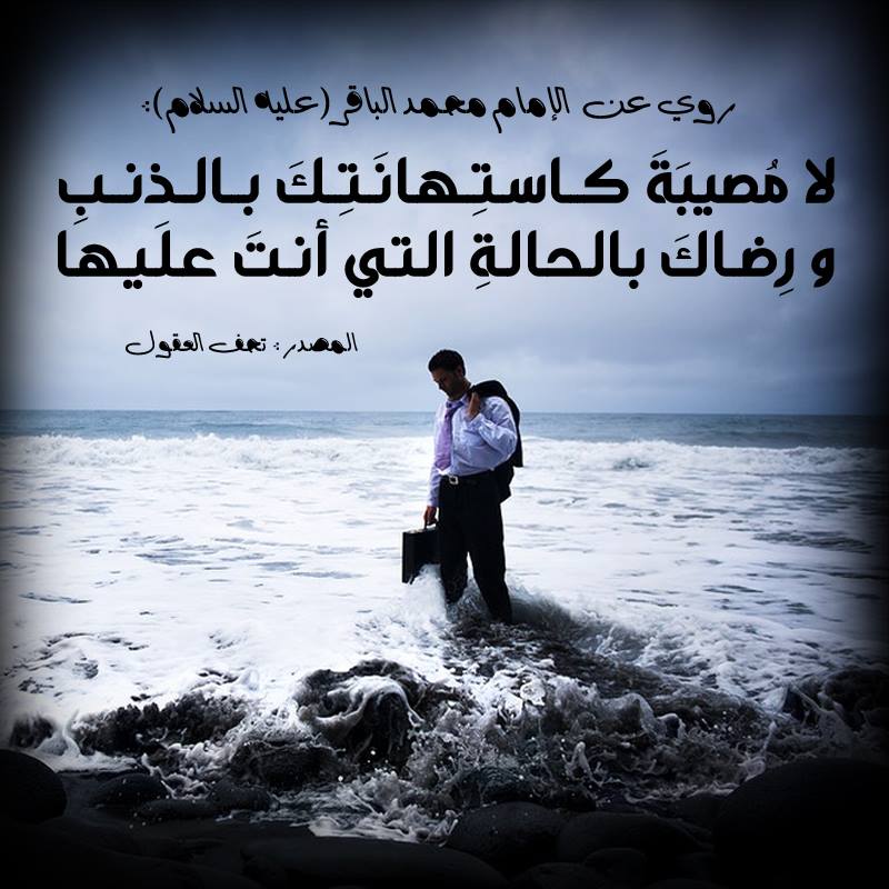 رُوِيَ عن الإمام محمد بن علي الباقر ( عليه السلام ) أنهُ قَالَ : لا مُصيبَةَ كاستِهانَتِكَ بالذنبِ و رِضاكَ بالحالةِ التي أنتَ علَيها .