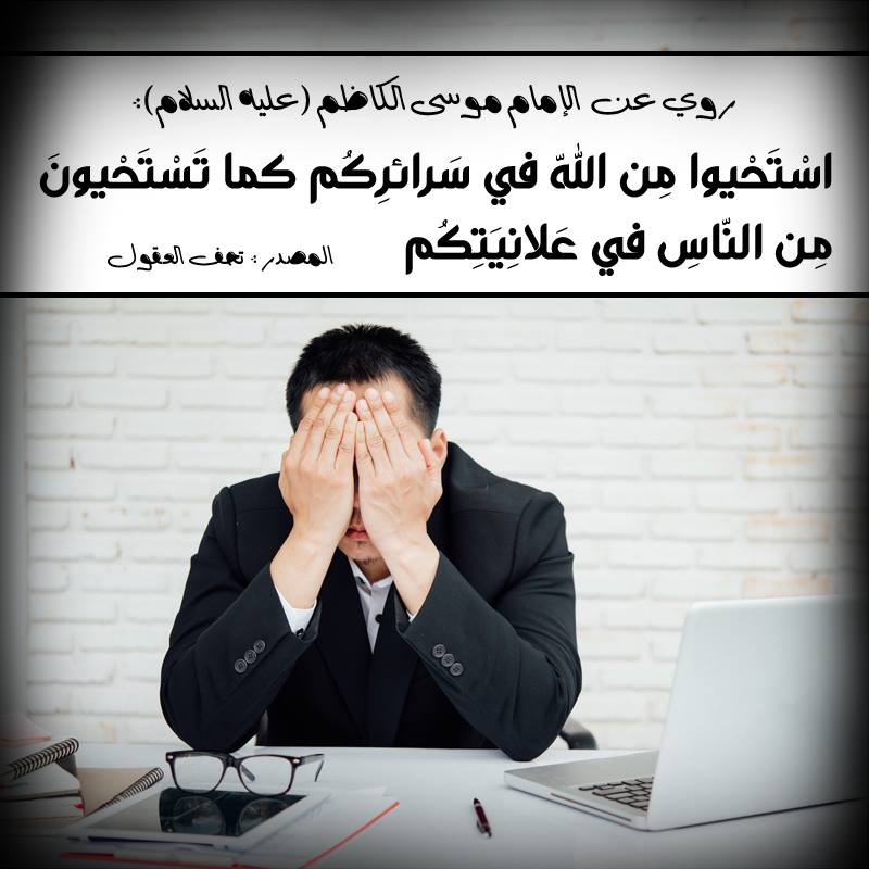 عن الإمام موسى بن جعفر الكاظم ( عليه السلام ) أنهُ قَالَ : اسْتَحْيوا مِن اللّه ِ في سَرائرِكُم كما تَسْتَحْيونَ مِن النّاسِ في عَلانِيَتِكُم .