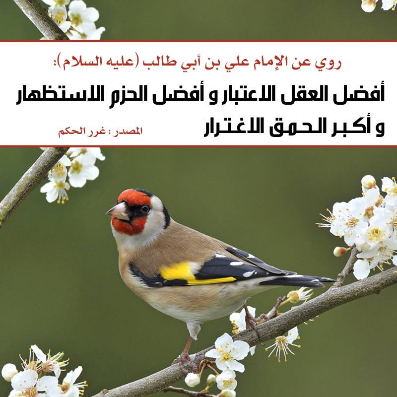الإمام عَلِيِّ بْنِ أَبِي طَالِبٍ ( عليه السَّلام ) أنهُ قَالَ : أفضَلُ العَقلِ الاعتِبارُ، وَ أفضَلُ الحَزمِ الاستِظهارُ، وَ أكبَرُ الحُمقِ الاغتِرارُ .
