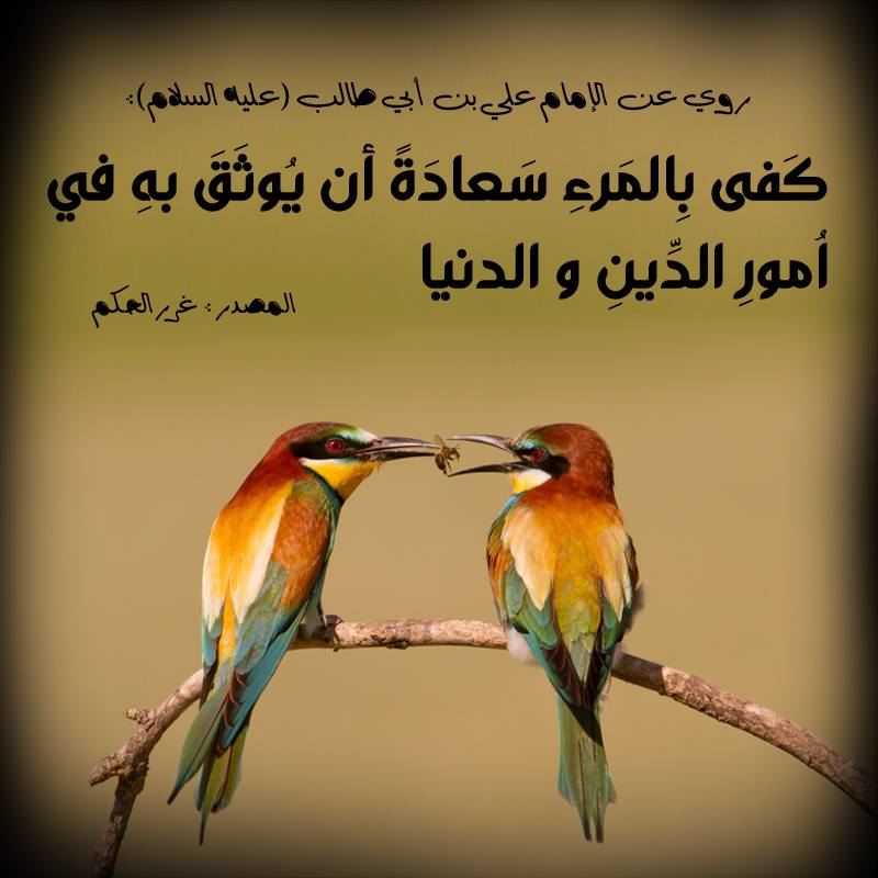 الإمام عَلِيِّ بْنِ أَبِي طَالِبٍ ( عليه السَّلام ) أنهُ قَالَ : كَفى بِالمَرءِ سَعادَةً أن يُوثَقَ بهِ في اُمورِ الدِّينِ و الدنيا .