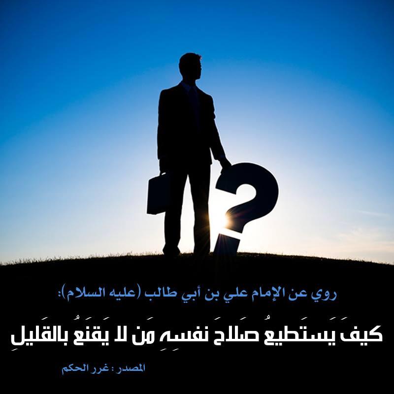 الإمام عَلِيِّ بْنِ أَبِي طَالِبٍ ( عليه السَّلام ) أنهُ قَالَ : كيفَ يَستَطيعُ صَلاحَ نفسِهِ مَن لا يَقنَعُ بالقَليلِ .