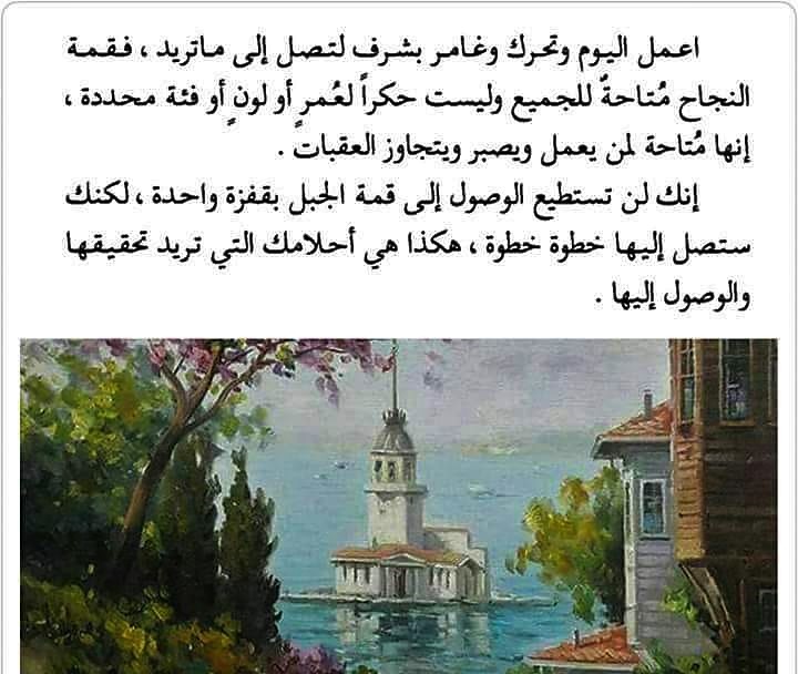 اعمل اليوم وتحرك وغامر بشرف لتصل الى ما تريد ، فقمة النجاح متاحة للجميع وليست حكراً لعمر أو لون أو فئة محددة ، انها متاحة لمن يعمل ويصبر ويتجاوز العقبات ...