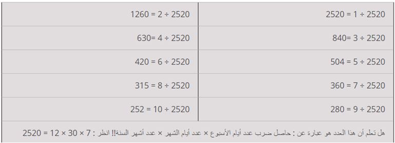 2520 هو أصغر رقم يقبل القسمة على الأرقام من 1 إلى 10 ويكون الناتج رقم صحيح دون كسور: