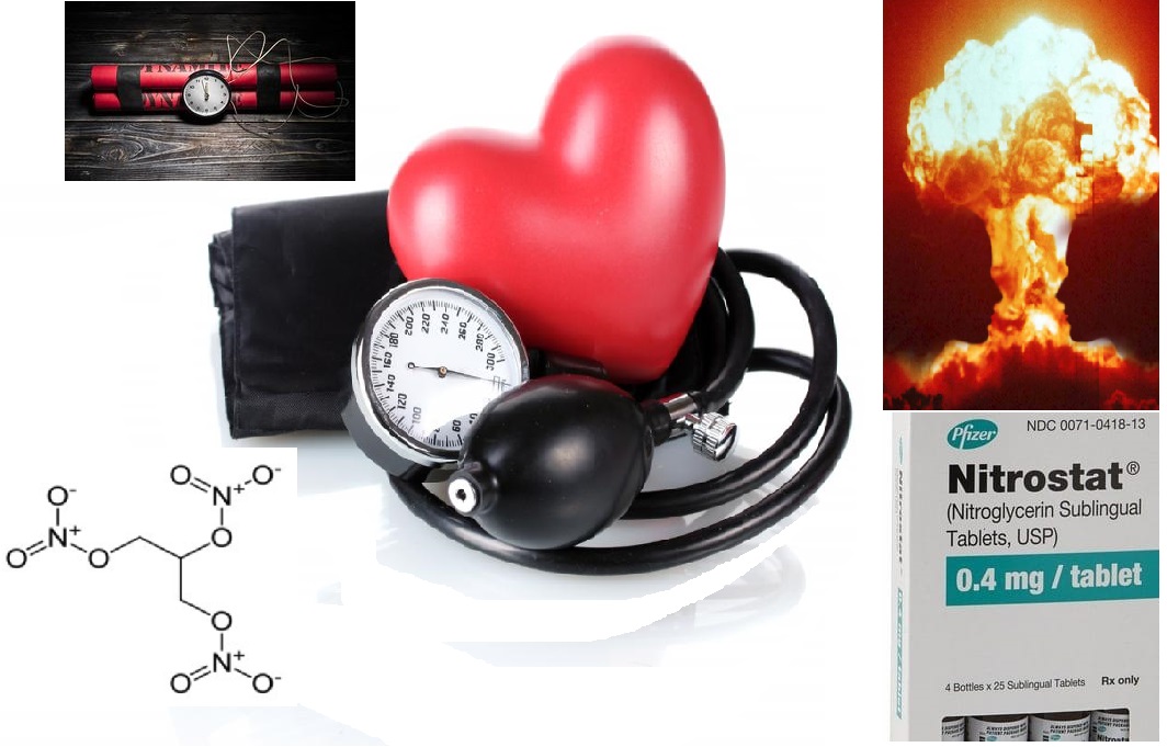 النايتروغليسرين Nitroglycerine مادة متفجرة شديدة الحساسية تجاه الصدمات او الاحتكاك والارتجاج وتدخل في كثير من الصناعات الحربية كالديناميت وخليط الـ(C4) وغيرها اكتشفه العالم الايطالي اسكانيو سوبريرو في عام 1847لاغراض معينة اما العالم ألفريد نوبل استخدمه كمتفجر اما العالم وليام موريل استخدمه كعلاج لتخفيف الام الصدر والقلب وهنا تحول هذا القاتل المتفجر الى احد اهم ادوية القلب والذبحة الصدرية التي تؤخذ تحت اللسان.