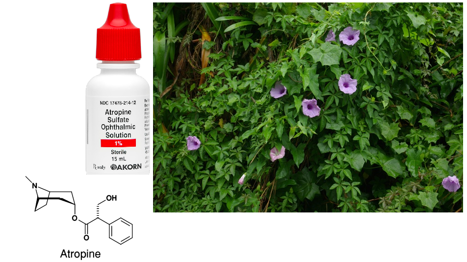 الاتروبين Atropine: : مادة منتجة طبيعيا يستخلص من نبتة تسمى ست الحسن (Atropa belladonna) وكثيرا مايستخدم الاتروبين في طب العيون كموسع لحدقة العين ومخفف للاحتقانات الناتجة عن الالتهاب وكذلك يستخدم في حالات حساسية الجهاز التنفسية لتوسيع القصبات الهوائية. قديما كان الاتروبين يستخدم كمواد تجميل حيث تضع النساء قطرات من المستخلص العشبي في اعينهن ليبدون بعيون اجمل