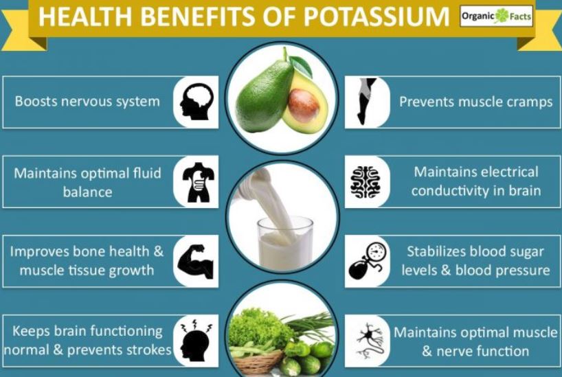 البوتاسيوم : يعتبر من العناصر الضرورية لصحة الانسان فهو يساهم في نقل الاشارات العصبية و الكهربائية عن طريق التبادل مع ايونات الصوديوم فهو مهم جدا لتقلص وانبساط العضلات ويمنع ترقق العظام لذلك نقص البوتاسيوم الناتج عن سوء التغذية يسبب مشاكل كثيرة منها الاصابة بالتشنجات العظلية, القلق والاجهاد, هشاشة العظام, اضطراب الدورة الدموية وضغط الدم و قصور الانتباه. يجب تناول الاطعمة الحاوية على البوتاسيوم مثل الموز والالبان والتمر والبطيخ مما يسد من حاجة الجسم اليومية فالمجهود الكبير يستهلك كمية كبيرة منه.