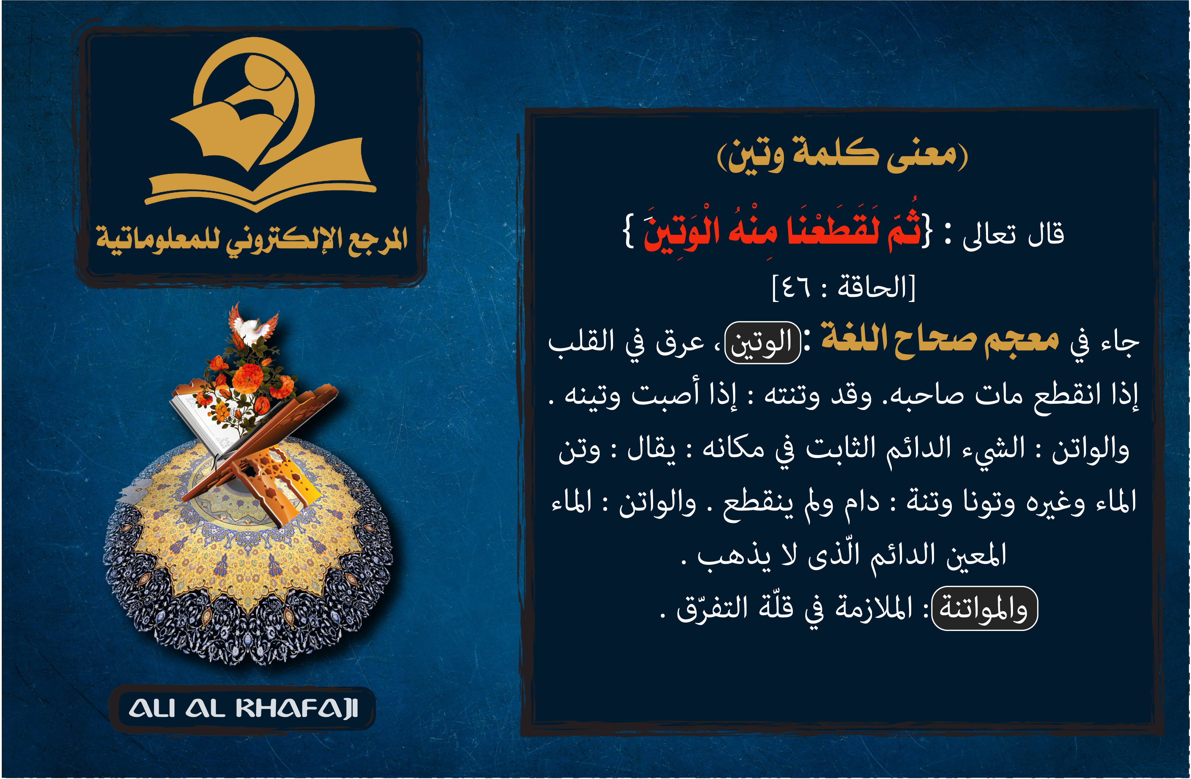 جاء في معجم صحاح اللغة : الوتين ، عرق في القلب إذا انقطع مات صاحبه. وقد وتنته : إذا أصبت وتينه . والواتن : الشي‌ء الدائم الثابت في مكانه : يقال : وتن الماء وغيره وتونا وتنة : دام ولم ينقطع . والواتن : الماء المعين الدائم الّذى لا يذهب .