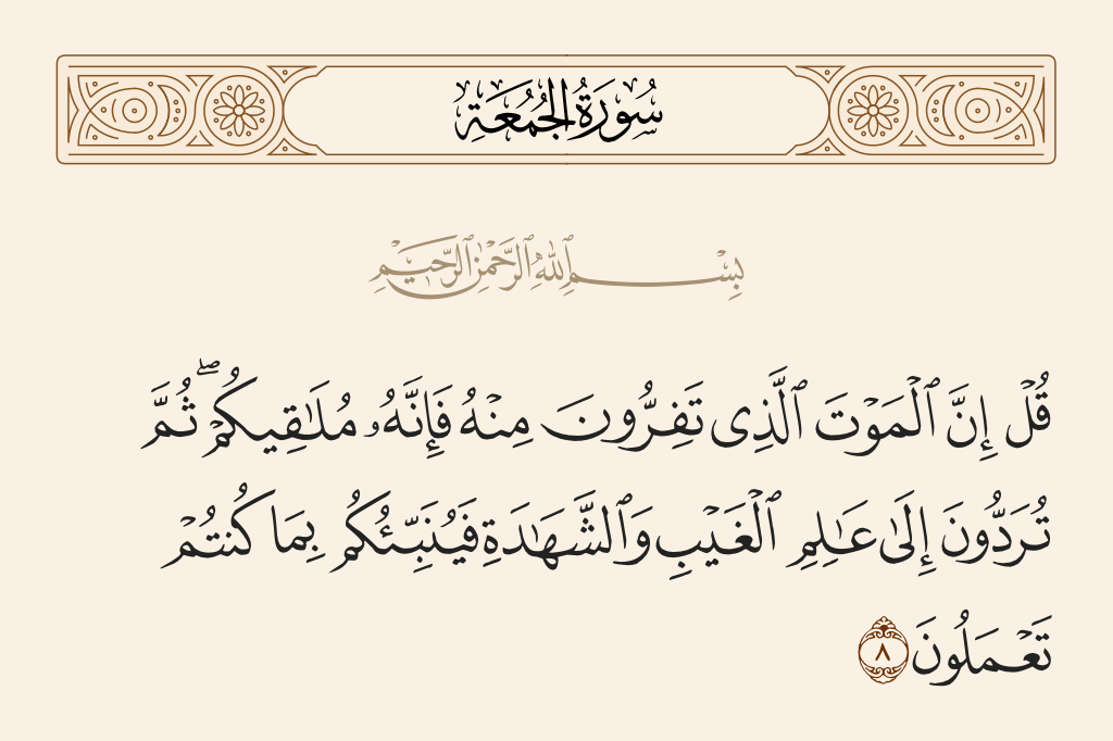 قال تعالى: {قُلْ إِنَّ الْمَوْتَ الَّذِي تَفِرُّونَ مِنْهُ فَإِنَّهُ مُلَاقِيكُمْ ثُمَّ تُرَدُّونَ إِلَى عَالِمِ الْغَيْبِ وَالشَّهَادَةِ فَيُنَبِّئُكُمْ بِمَا كُنْتُمْ تَعْمَلُونَ} [الجمعة: 8].