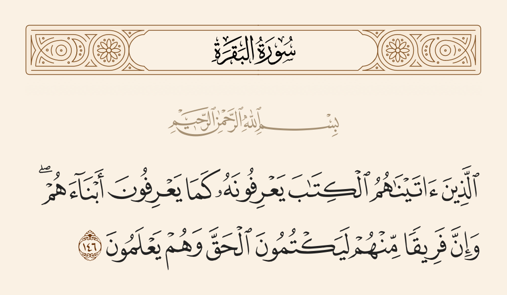 عن حريز، عن أبي عبدالله (عليه السلام)، قال: نزلت هذه الآية في اليهود والنصارى، يقول الله تبارك وتعالى: (الذين آتيناهم الكتاب) يعني: التوراة والإنجيل (يعرفونه) يعني: يعرفون رسول الله (كما يعرفون أبناءهم) لأن الله عزوجل قد أنزل عليهم في التوراة والإنجيل والزبور صفة محمد (صلى الله عليه واله)، وصفة أصحابه ومهاجرته(1)
