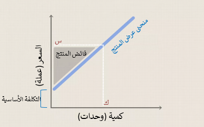 فائض المنتج = إجمالي الإيرادات – التكلفة. نظراً إلى المنحنى نجد أنه لا يبدأ من الصفر،بل من نقطة أعلى تسمى التكلفة الأساسية لإنتاج وحدة من المنتج وهي تشمل الأساسيات التي تسمح للمُنتِج بالإنتاج،إذ إن المُنتِج لن يستطيع بيع سلعته دون أن يحصل على الأقل على التكلفة الأساسية لإنتاج تلك المنتجات. ومن وجهة نظر اقتصادية ؛ التكاليف الأساسية تتضمن تكلفة الفرصة البديلة وهي تكلفة عدم القيام بشيء مختلف مثل إنتاج منتج آخر أو الاستثمار في جهة أخرى.وينشأ فائض المنتج من الفرق بين سعر بيع السلعة وتكلفة إنتاجها.