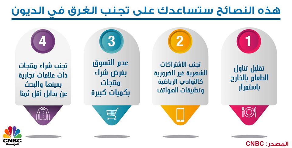 نصائح لتجنب الغرق في الديون : 1ـ تقليل تناول الطعام بالخارج باستمرار ، 2ـ تجنب الاشتراكات الشهرية غير الضرورية كالنوادي الرياضية وتطبيقات الهاتف والشراء بالاقساط والقروض العالية وغيرها، 3ـ عدم التسوق بفرض شراء منتجات بكميات كبيرة قد تزيد عن الحاجة ، 4ـ تجنب شراء منتجات ذات علامات تجارية بعينها (ماركات) والبحث عن بدائل اقل ثمناً .