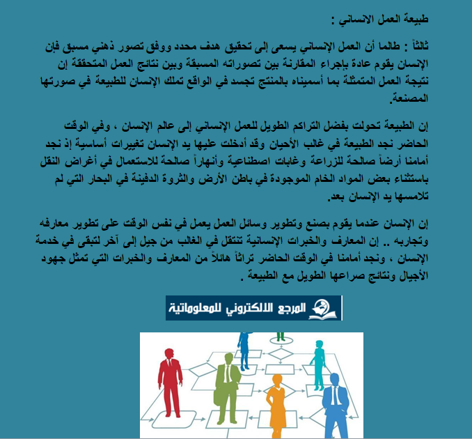 العمل والانتاج : العمل في الأصل عبارة عن عملية تجري بين الإنسان والطبيعة ، وفي هذه العملية ينشئ الإنسان وينظم ردود الفعل المادية بينه وبين الطبيعة ، إن عملية العمل هذه ضرورة حتمية لوجود الجنس البشري واستمراره ، ذلك لأن القسم الأعظم من المواد المتوفرة في الطبيعة لا تكون جاهزة للاستعمال المباشر وإشباع الحاجات الإنسانية قبل أن تجري عليها عمليات التحويل الضرورية ، وعندما يقيم الإنسان عن طريق النشاط الذي يبذله علاقة بينه وبين الطبيعة ، فإنه يهدف إلى تغيير عناصرها وإخضاعها لحاجاته ومتطلباته.