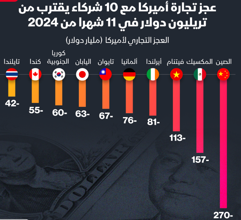 مع "الحرب التجارية" التي أشعل فتيلها الرئيس الأميركي دونالد #ترامب برسوم جمركية طالت #الصين و #المكسيك و #كندا...تعرف على قيمة العجز التجاري لأميركا مع تلك الدول .
