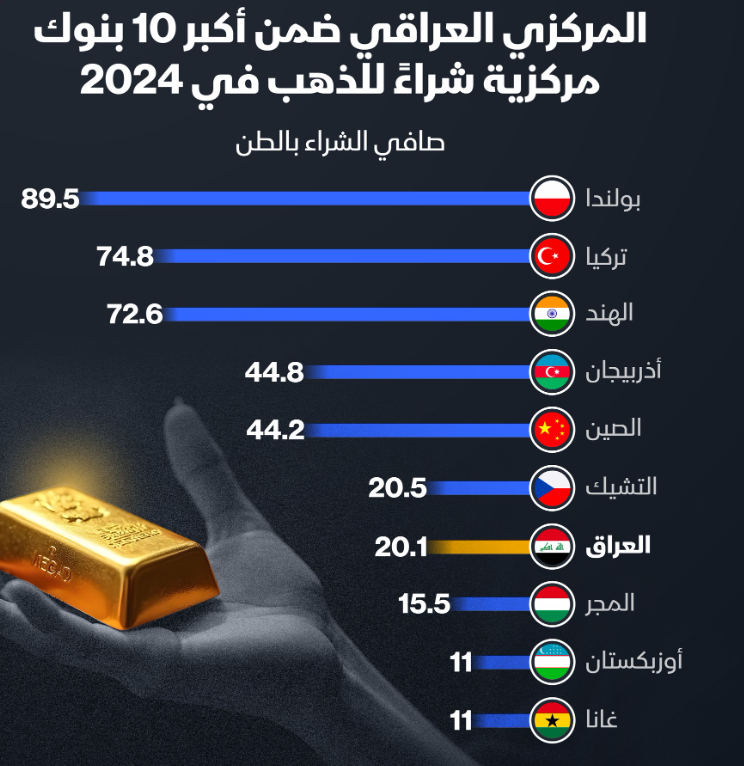 البنك #المركزي_العراقي يحل سابعاً بين أكثر 10 بنوك شراءً لـ #الذهب في 2024 بنحو 20.1 طناً .