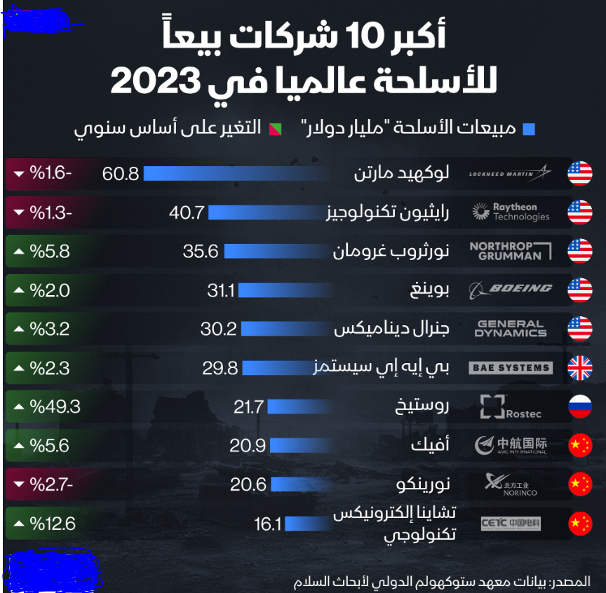 أميركا تهيمن على نصف القائمة..تعرف على أكبر 10 شركات بيعاً للأسلحة عالمياً خلال 2023