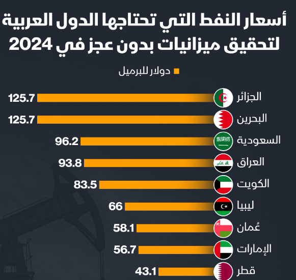 أسعار #النفط تراجعت دون مستوى 70 دولاراً للبرميل، خلال الاسبوع الماضي ، وذلك للمرة الأولى منذ عامين، مما قد يؤثر سلباً على الجزائر و البحرين و السعودية و العراق و الكويت، إذ تحتاج هذه الدول لسعر نفط فوق 83 دولاراً للبرميل لتحقيق ميزانيات دون عجز في 2024 .