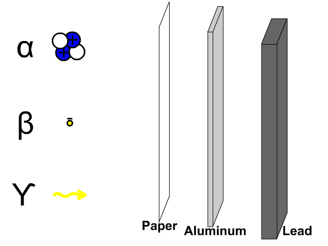 بينت الدراسات وجود ثلاثة أنواع من الإشعاعات المؤينة تختلف في القابلية على اختراق المواد وقد سميت بالأحرف الثلاثة الأولى من الأبجدية اليونانية ألفا وبيتا ، وكاما وتتفاوت أنواع الإشعاعات في اختراقها للمواد.حيث الفا يمكن صدها بحاجز ورقي وبيتا يمكن صدها بحاجز من الالمنيوم بينما صد اشعة غاما لايمكن صدها الا بحاجز من الرصاص او عناصر او مركبات ثقيلة