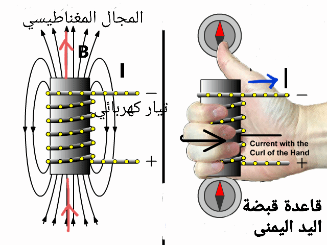 تُوضّح الصورة مبدأ تولّد المجال المغناطيسي حول سلك يمر فيه تيار كهربائي مستمر. فعندما يمر التيار في موصل مستقيم، يتشكل حوله مجال مغناطيسي دائري في المستوى العمودي على السلك يُحدد اتجاه هذا المجال باستخدام قاعدة اليد اليمنى؛ إذ يشير الإبهام إلى اتجاه التيار، بينما يتبع انحناء الأصابع اتجاه خطوط المجال المغناطيسي. هذا المبدأ أساسي في الكهرومغناطيسية ويُستخدم في تصميم المحركات والمحاثات يمثّل هذا التأثير العلاقة بين التيار والمغناطيسية، ويُعد من الأسس التي قامت عليها نظرية الحقل الكهرومغناطيسي.