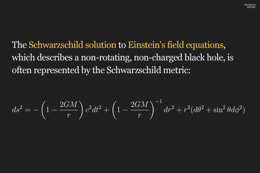 توفر هذه المعادلة نموذجًا رياضيًا لهندسة الزمكان حول ثقب أسود كروي غير دوار بدلالة نصف قطر شفارتزشيلد، حيث G هو ثابت الجاذبية، وM هي كتلة الثقب الأسود، وr هو الإحداثي الشعاعي، وc هو سرعة الضوء، t هي إحداثيات الوقت، و θ و ϕ هي الإحداثيات الزاوية.