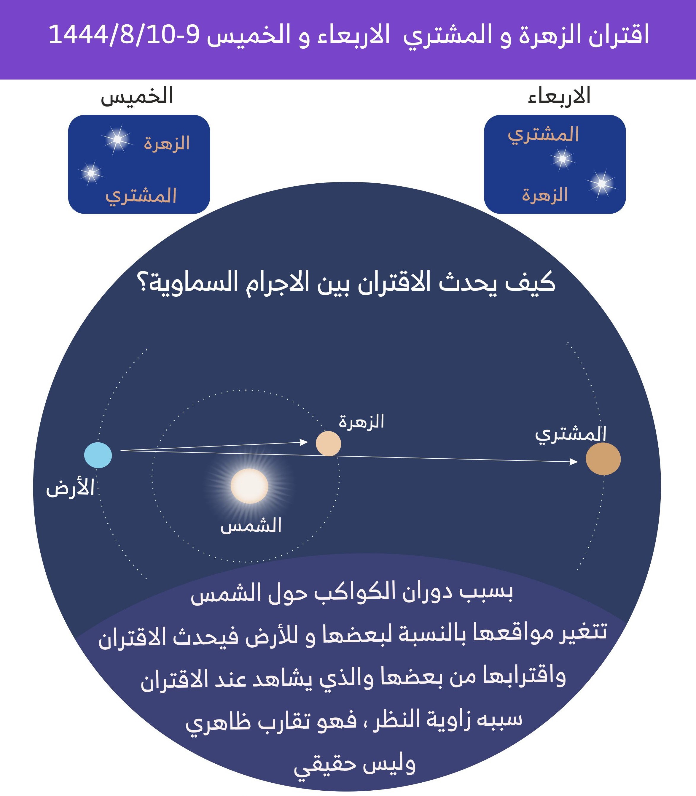 الأقتران واقتراب الاجرام السماوية من بعضها هو اقتراب ظاهري وليس حقيقي، في المرفق شرح كيف يحدث الاقتران.