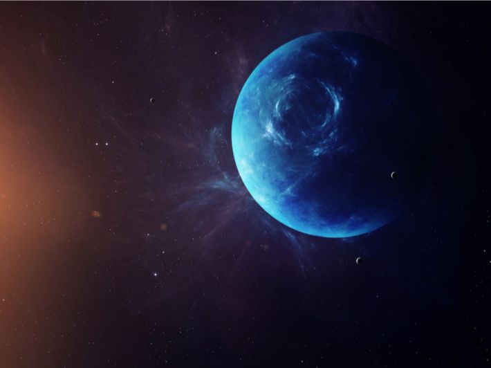 يكتمل دوران كوكب نبتون حول الشمس في مداره كل 165 سنة، ويصل عمق غلافه الجوي إلى مسافات كبيرة، حيث يندمج غلافه الجوي بالماء والجليديات الذائبة بشكلٍ تدريجي فوق نواته الصلبة الضخمة التي تبلغ كتلتها نفس كتلة كوكب الأرض، ويعتبر مركب الميثان الموجود في غلافه الجوي السبب وراء اللون الأزرق للكوكب,