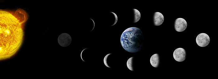 أكثر الأشياء التي يمكن ملاحظتها في القمر ونحن نراه من الأرض ، هو شكله الذي يظهر متغيراً حيث إنه ينمو من هلال رفيع يزداد سمكاً ليلة بعد ليلة ، حتى يصبح قرصاً كامل الاستدارة ، ثم يبدأ في الانكماش شيئاً فشيئاً متخذاً بطريقة عكسية نفس الأشكال التي نما بها ، حتى يختفي في النهاية كليا .
