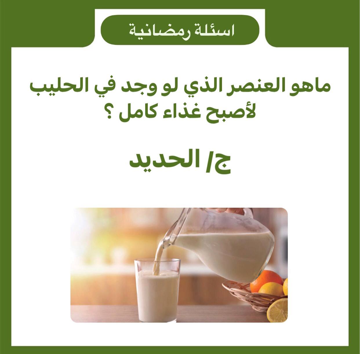 ما هو العنصر الذي لو وجد في الحليب لاصبح غذاء كامل ؟