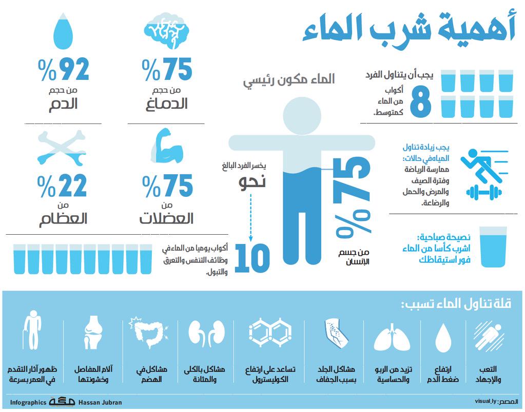 الجسم يحتاج إلى ترطيب مستمر. شرب الماء بكميات كافية يدعم وظائف الكلى، يحافظ على درجة حرارة الجسم، ويمنع الإمساك والإجهاد.