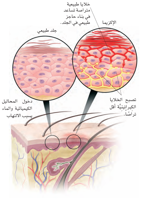 تُظهر الدائرتان جزءين من الجلد بدقة اكبر . ففي الجزء الطبيعي تكون الخلايا متراصة ولكن حين الاصابة بالإكزيما تكون الخلايا الكيراتينية اقل تراصاً فتصبح اكثر عرضة للعوامل الخارجية مثل المحاليل الكيميائية والماء ما يؤدي الى ذوبان الحاجز الطبيعي للجلد .