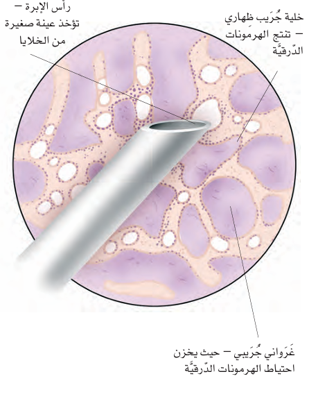 تُظهر الرؤية المجهرية للغدة الدرقية جُريبات (Follicles) تشبه كرات غولف غير مكتملة الاستدارة. وتعود التعرجات الظاهرة على سطح هذه الجريبات إلى الخلايا الجُريبية (Follicular Cells)، وهي الخلايا المسؤولة عن إنتاج الهرمونات الدرقية، مثل T₄ و T₃وإفرازها إلى الشعيرات الدموية المجاورة (Capillaries). أما المادة الموجودة داخل الجريبات، وهي الغُرواني (Colloid)، فتتكون أساسًا من الثيروغلوبيولين (Thyroglobulin)، وتعمل كمخزون لهرمونات الغدة الدرقية قبل…