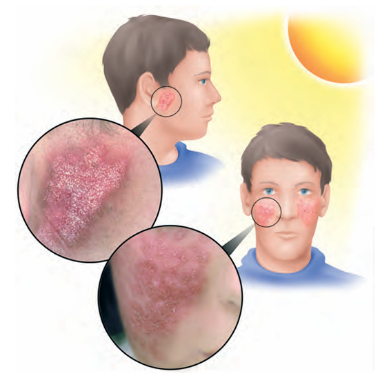 هو مرض مناعي نادر ، يهاجم فيه الجسم انسجته الخاصة في المناطق التي تتعرض للشمس ويظهر في الصورة ما يبدو عليه المرض .