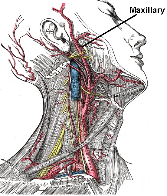 وهو الشريان الذي يزود الدم الى المناطق العميقة من الفك الاعلى , والمناطق المحيطة بالفكين , ويتفرع منه فرعاً مهماً يتجه الى داخل الجمجمة ليغذي الام الجافية ( Dura mater ) يسمى هذا الفرع الشريان السحائي الاوسط ( Middle Meningeal Artery) كما يزود عظام الجمجمة , وخاصة في الحفرة القحفية الوسطية وما يعلوها من عظام القحف .