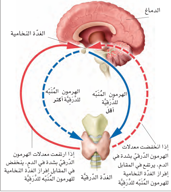 تنتج الغدة الدرقية الهرمونات الدرقية , وتنظم الغدة النخامية هذه العملية , ما يؤدي الى افراز الهرمون المنبه للدرقية كاستجابة على معدلات الهرمونات الدرقية في الجسم .