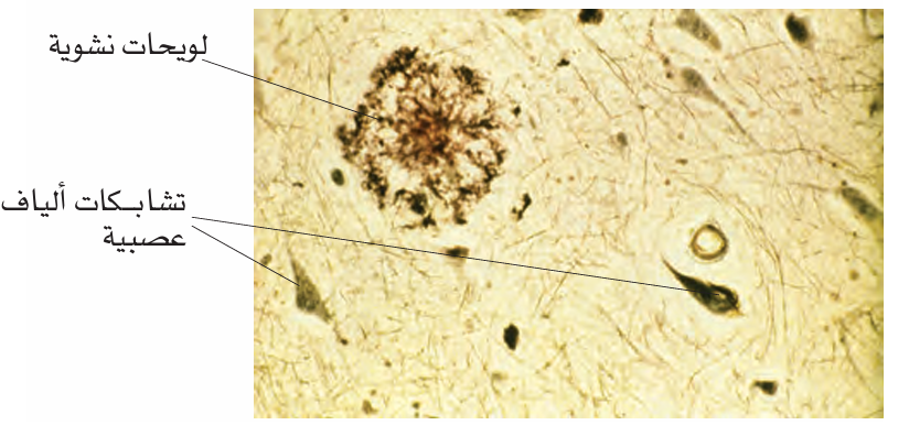 نسيج دماغ تحت المجهر يظهر فيه تشابكات الألياف العصبية واللويحات نتيجة الاصابة بمرض الزهايمر .