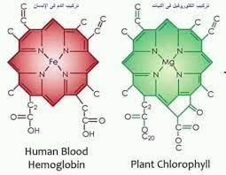 أن هناك تشابه فى التركيب الفراغى لكل من الكلورفيل (صبغة خضراء تعطي النباتات اللون الأخضر كما أنه يقوم بدور أساسي في عملية التمثيل الضوئي التي تشكل أساس الحياة على الأرض) والهيموجلوبين (خضاب الدم وهو بروتين محمول داخل خلايا الدم الحمراء) ولكن الفرق الوحيد هو وجود ذرة الحديد Fe فى جزئ الهيموجلوبين بينما يوجد ذرة المغنسيوم Mg فى جزئ الكلوروفيل