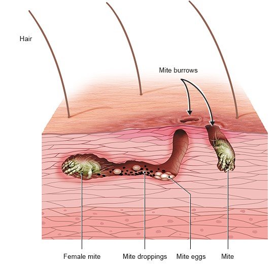 الجرب سببه العث Sarcoptes scabiei وهو نوع من الحشرات الصغيرة التي تحفر تحت طبقة الجلد لتضع بيضها.