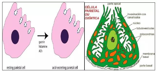 خلايا الجدارية Parietal Cells: خلايا طلائية تعرف ايضا ب Delomorphous Cells , Oxyntic Cells تفرز حامض الهيدروكلوريك HCl و عوامل هضم داخلية Gastric Intrinsic Factor ، توجد في الغدد المعدية الموجودة في بطانة المعدة ، تحوي الخلايا على شبكة افراز كبيرة تسمى Canaliculi التي تنتج وتفرز HCl بطريق النقل الفعال الى وسط المعدة وتحوي على انزيم فريد H+/K+ ATPase الذي ينقل البروتون عكس التركيز الذي يصل الى 3 مليون : 1 اي تركيز ايون الهيدروجين يكون 3 ملايين مرة اعلى من تركيزه في الدم.