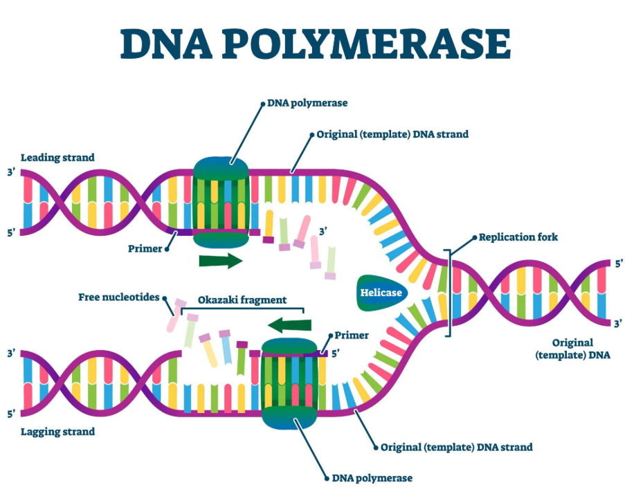 هو الإنزيم الذي يصنع نسخاً جديدة من الـDNA حيث يضيف القواعد الجديدة إلى السلسلة النامية باتجاه 5′→3′ اعتماداً على قاعدة التكامل بين القواعد (A مع T، و G مع C)، ويستطيع أيضاً تصحيح بعض الأخطاء أثناء النسخ. في البكتيريا يعمل DNA Pol III كإنزيم رئيسي للنسخ بينما يساعد DNA Pol I في إزالة البادئات وإكمال السلسلة أما في الإنسان فيبدأ النسخ بإنزيم Pol α ثم يكمل Pol δ نسخ الشريط المتأخر و Pol ε نسخ الشريط الرئيسي في حين يقوم Pol β بإصلاح الأخطاء و Pol γ بنسخ DNA…