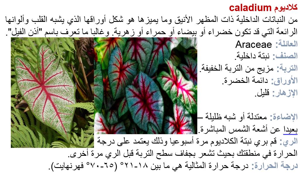 الكلاديوم من النباتات الداخلية ذات المظهر الأنيق وما يميزها هو شكل أوراقها الذي يشبه القلب وألوانها الرائعة التي قد تكون خضراء أو بيضاء أو حمراء