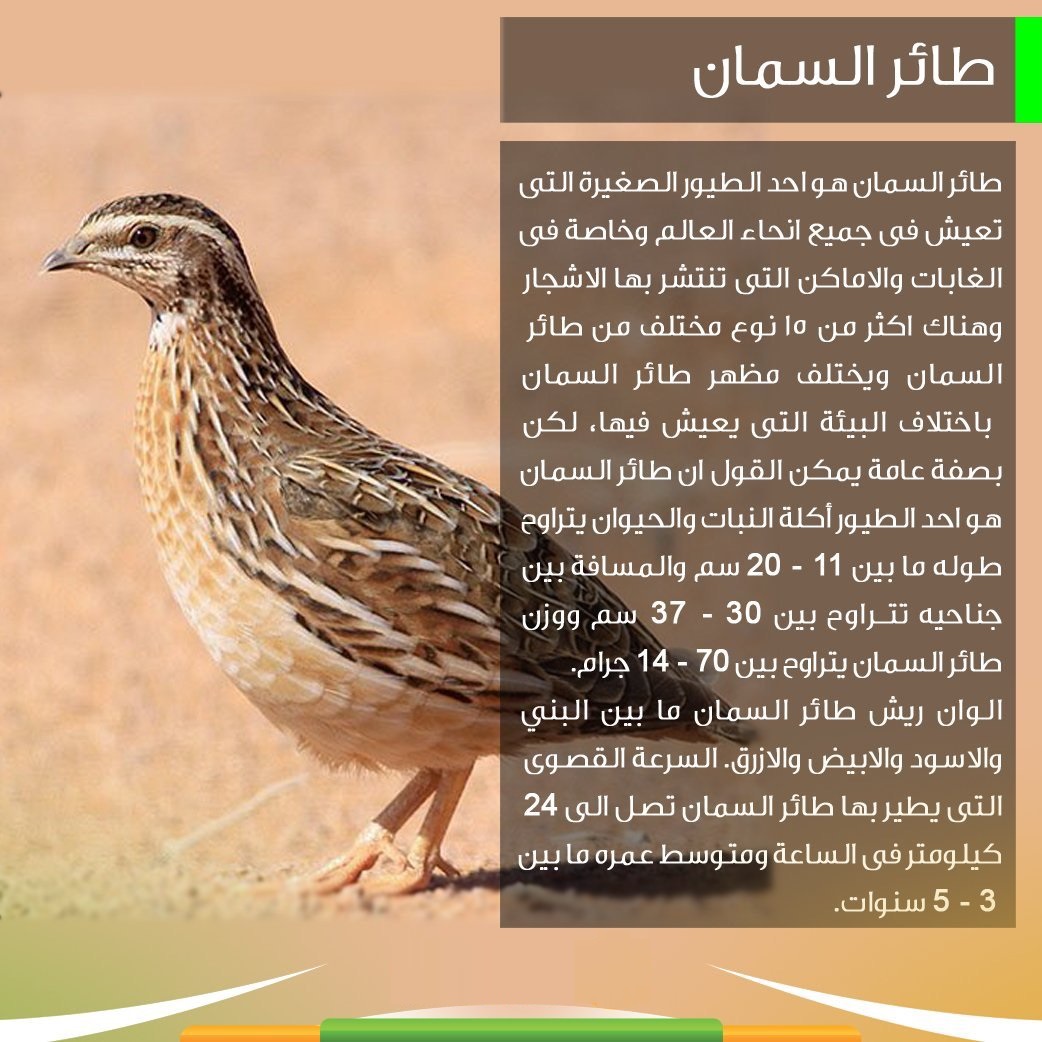 طائر السمّان هو من الطيور المُنتشرة في آسيا وأوروبا وإفريقيا، ويُعتبر من الطيور المهاجرة التي تقضي فصل الصيف في قارّة أوروبا، وفي الشتاء تُهاجر إلى إفريقيا. السمّان صغير الحجم، طوله حوالي 17سم، وله شكل مستدير، وذقن ذكور السمان تكون بيضاء اللون. يتميّز السمان بجناحين قويين وطويلين يتناسبان مع هجرته لمسافاتٍ شاسعة.