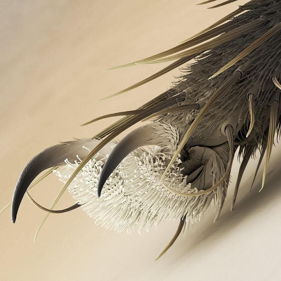 ارجل المشي على السطوح الملساء في الذباب، صورة بالمجهر الإلكتروني لاحظ الممصات والخطاطيف والاشواك..