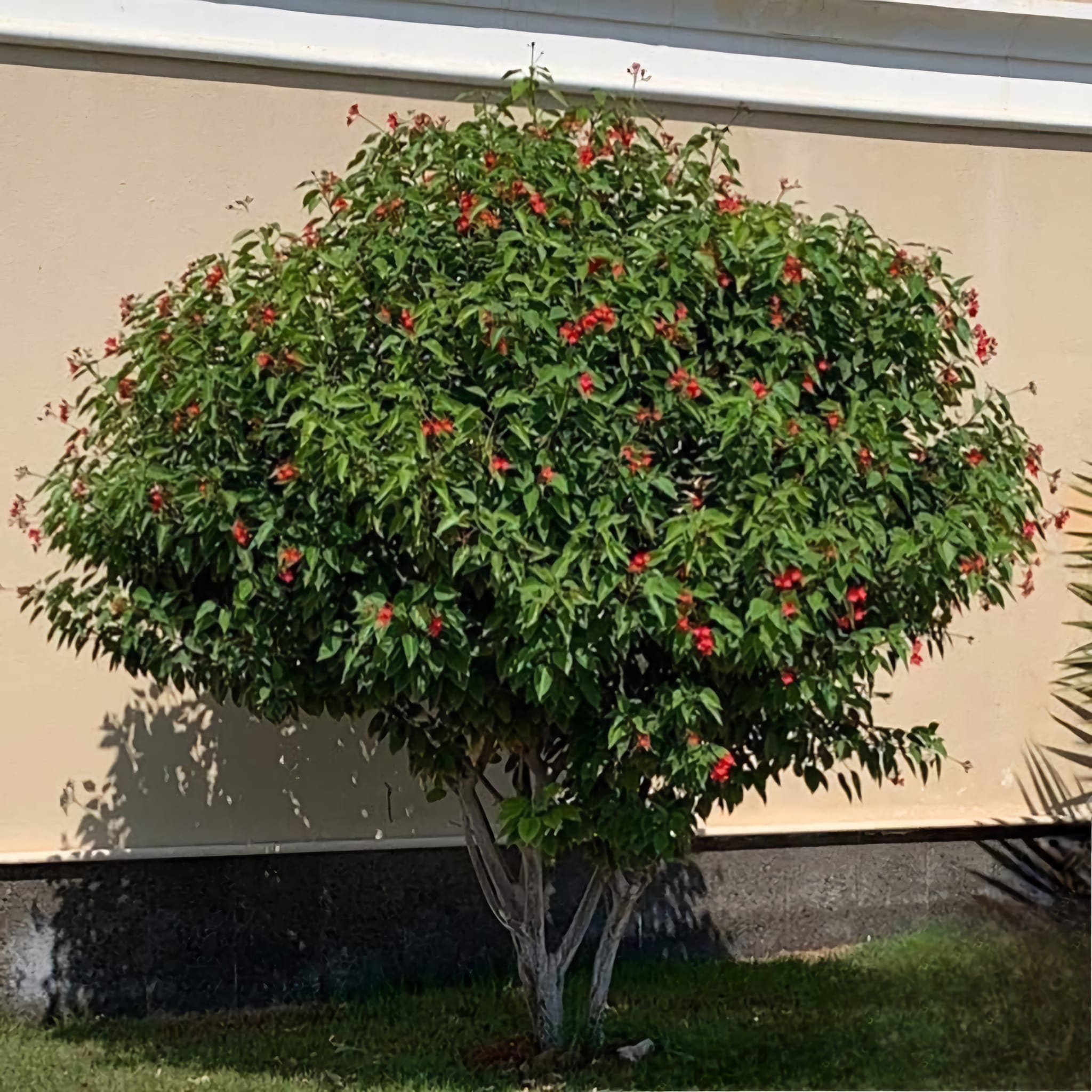 نبات خارجي شجيرة نموها الخضري كثيف وتنمو الى ارتفاع يصل الى 3 م سيقانها متعدده ويمكن بواسطة التقليم الحصول على نبات ذو ساق واحد لها ازهار حمراء قرمزية اللون ذات اسديه صفراء ومن اسمائه الشائعه (بيرقرنا) يزهر طول الفتره الدافئه ازهار الشجيره تجذب النحل يضم الجاتروفا حوالي 175 نوع تختلف فيما بينهم اختلافاً واضحاً.