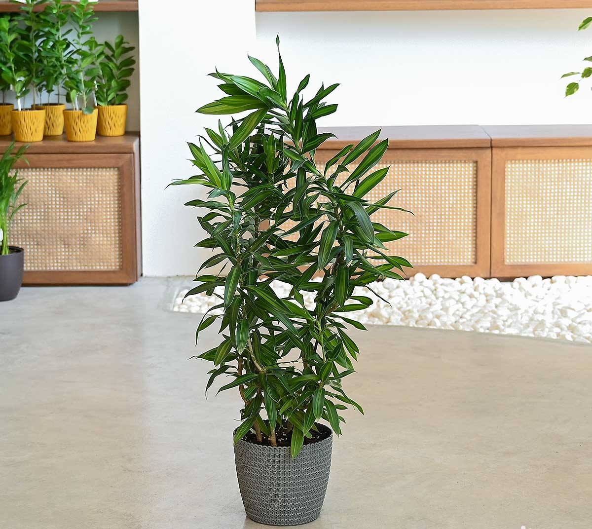 نبات دراسينا جامايكا Dracaena reflexa ‘Song of Jamaica’، من النّباتات الاستوائيّة التي يعود موطنها إلى مدغشقر، من النّباتات المُميزة التي تنمو كشجيرة صغيرة الحجم بأوراقها المدببة اللامعة خضراء اللون مع عروق كريميّة اللّون في المنتصف، يصل ارتفاعه في مرحلة النُّضج من 3-5 م في حين يصل انتشاره ما بين 1- 1.5 م، مما يجعله خيارا مُناسبًا لملء الفراغات في المنازل وبيئات العمل حيثُ يُضفِي جمالاً ورونقًا على المساحات التي يُوضَع فيهَا، ويمتاز بسُهولة العناية وعدم الحاجة إلى الرعاية المستمرّة والكثيفة..