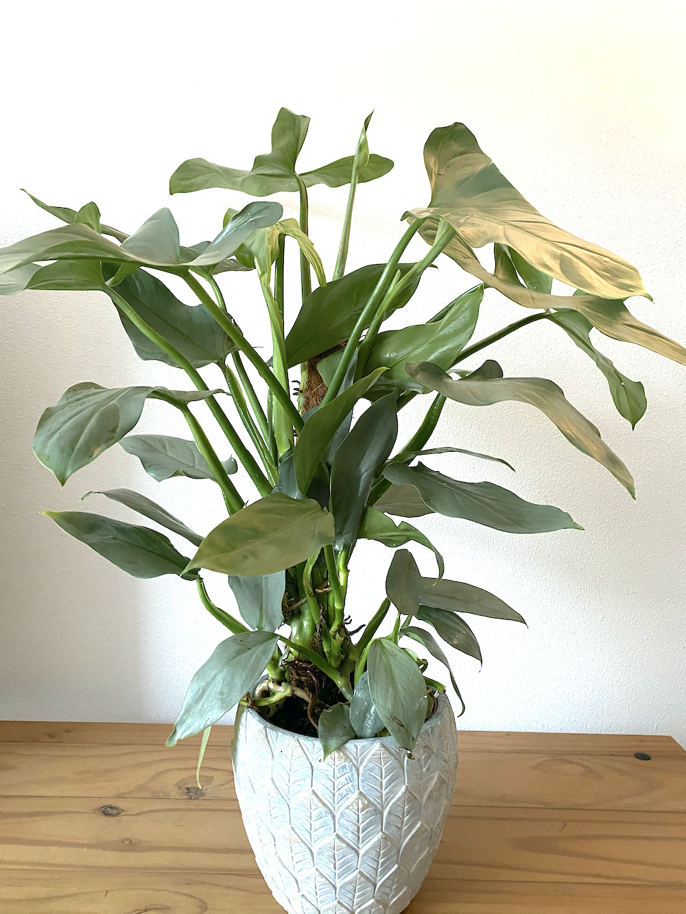 نبات متسلق محب للظل الكثيف يصل طوله إلى ١٥٠ سم ذو أوراق متوسطة الاخضرار سهمية الشكل لحمية ملساء، يصل طولها إلى ١٨ سم، تنمو على أعناق عريضة لحمية لينمو النبات إلى أعلى.
