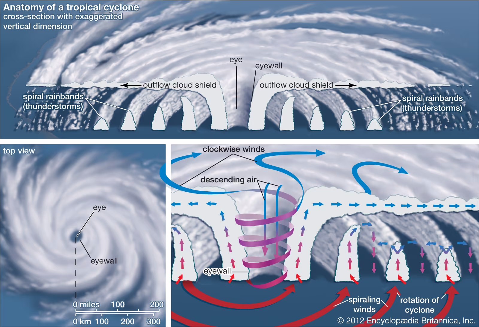 تتحرك الأعاصير المدارية من الشرق إلى الغرب وليس من الغرب إلى الشرق كما هو حال المرتفعات الجوية، والسبب في ذلك هو أن الأعاصير المدارية تقع في نطاق الرياح التجارية التي تهب من الشرق إلى الغرب بينما تقع المنخفضات الجوية في نطاق الرياح الغربية.