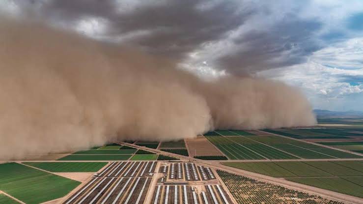 العواصف الغبارية : هي عبارة عن حبيبات دقيقة الحجم لا تتجاوز أقطارها(100 ميكروميتر), تنشأ هذه العواصف بسرعة رياح تصل الى (8كم/ساعة فأكثر) وتكون محملة بالأتربة المنقولة من التربة السطحية المفككة في المناطق الجافة إذ تعمل الرياح الشديدة السرعة على رفع الغبار لارتفاعات عالية تبلغ عدة آلاف من الأمتار الأمر الذي يعمل على خفض مدى الرؤية الى أقل من (1كم) تقريباً.