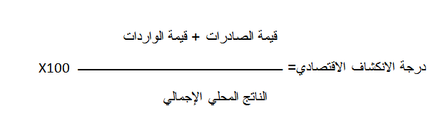 مؤشر درجة الانكشاف الاقتصادي: وهو احد المؤشرات لقياس التبعية الاقتصادية, من خلال أَهمية الصادرات والاستيرادات من الناتج المحلي الاجمالي، وأَحياناً لا يعني ارتفاعه دليل على التبعية الاقتصادية وإِنما يشير إِلى إمكانية تعرض اقتصاد الدولة إِلى الاختلال نتيجة لظروف تحيط بالتجارة الخارجية, ويتم احتساب مؤشر الانكشاف الاقتصادي من خلال المعادلة الأَتية: